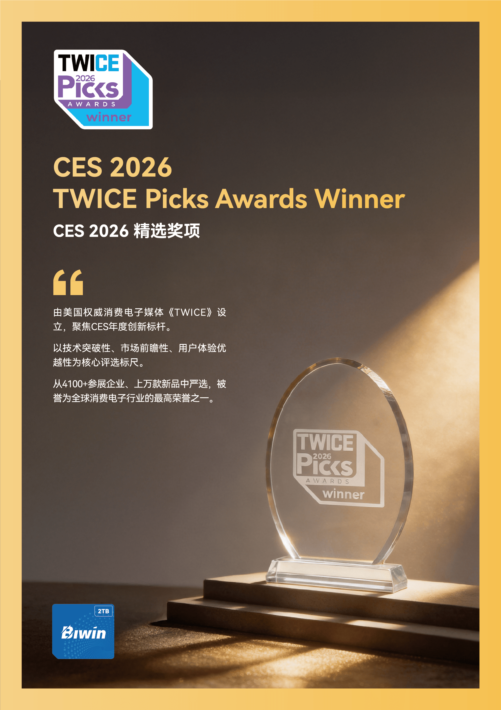 在被誉为“全球科技风向标”的 CES 2026 上,Mini SSD 从全球 4000 多家参展商、数万件展品中脱颖而出,荣获由美国权威消费电子媒体《TWICE》颁发的“TWICE Picks Awards大奖。该奖项是 CES 官方合作伙伴设立的标杆性荣誉,旨在甄选出兼具突破创新设计、卓越品质与巨大市场潜力的巅峰之作,被业界视为消费电子领域的“品质与创新通行证”。