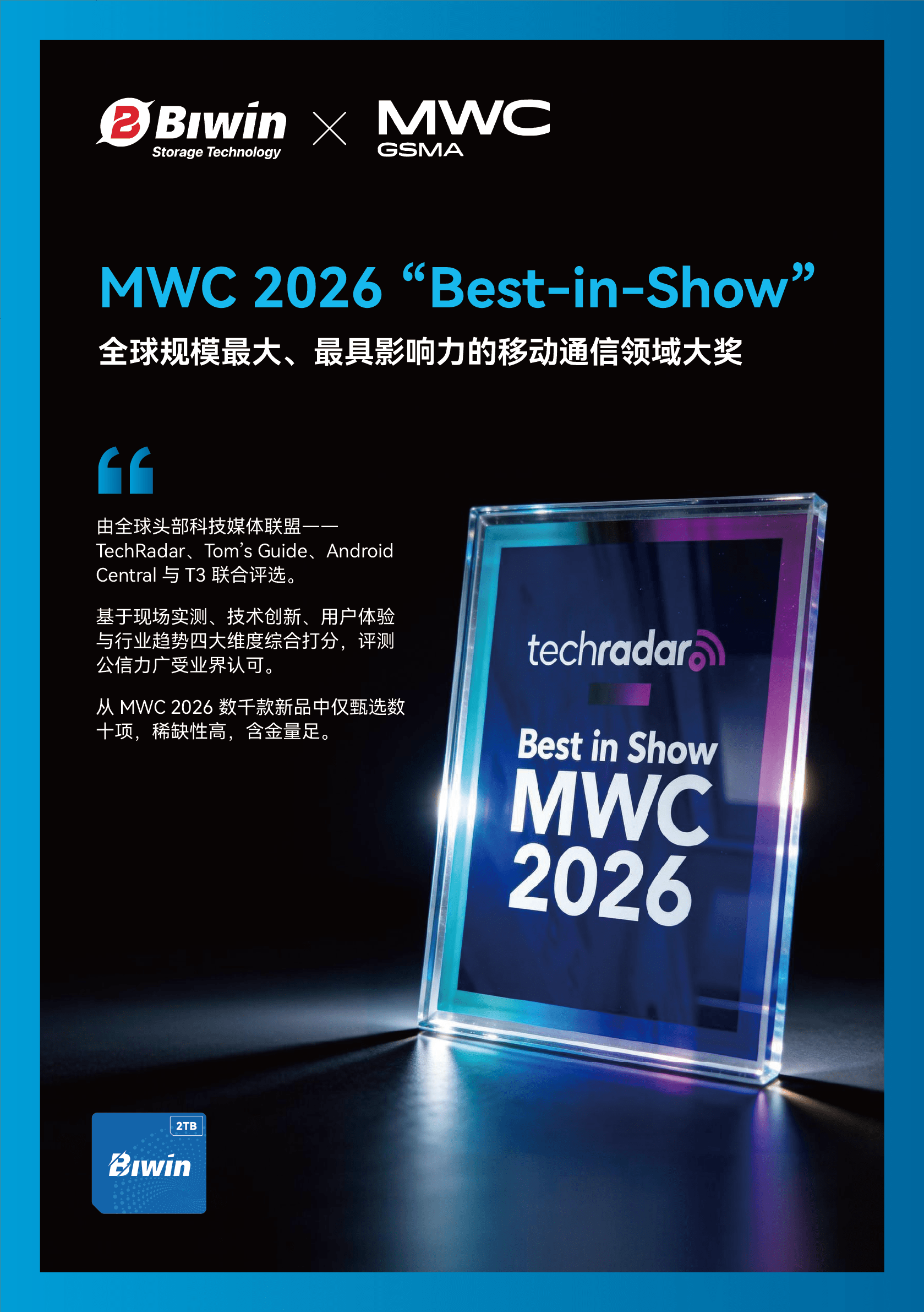 MWC 2026 "Best-in-Show是移动通信与科技领域的顶级荣誉之一,该奖项由全球头部科技媒体联盟——TechRadar、Tom’s Guide、Android Central 与 T3 联合评选,Mini SSD的获奖,代表其技术创新、用户体验已赢得全球行业的广泛认可。