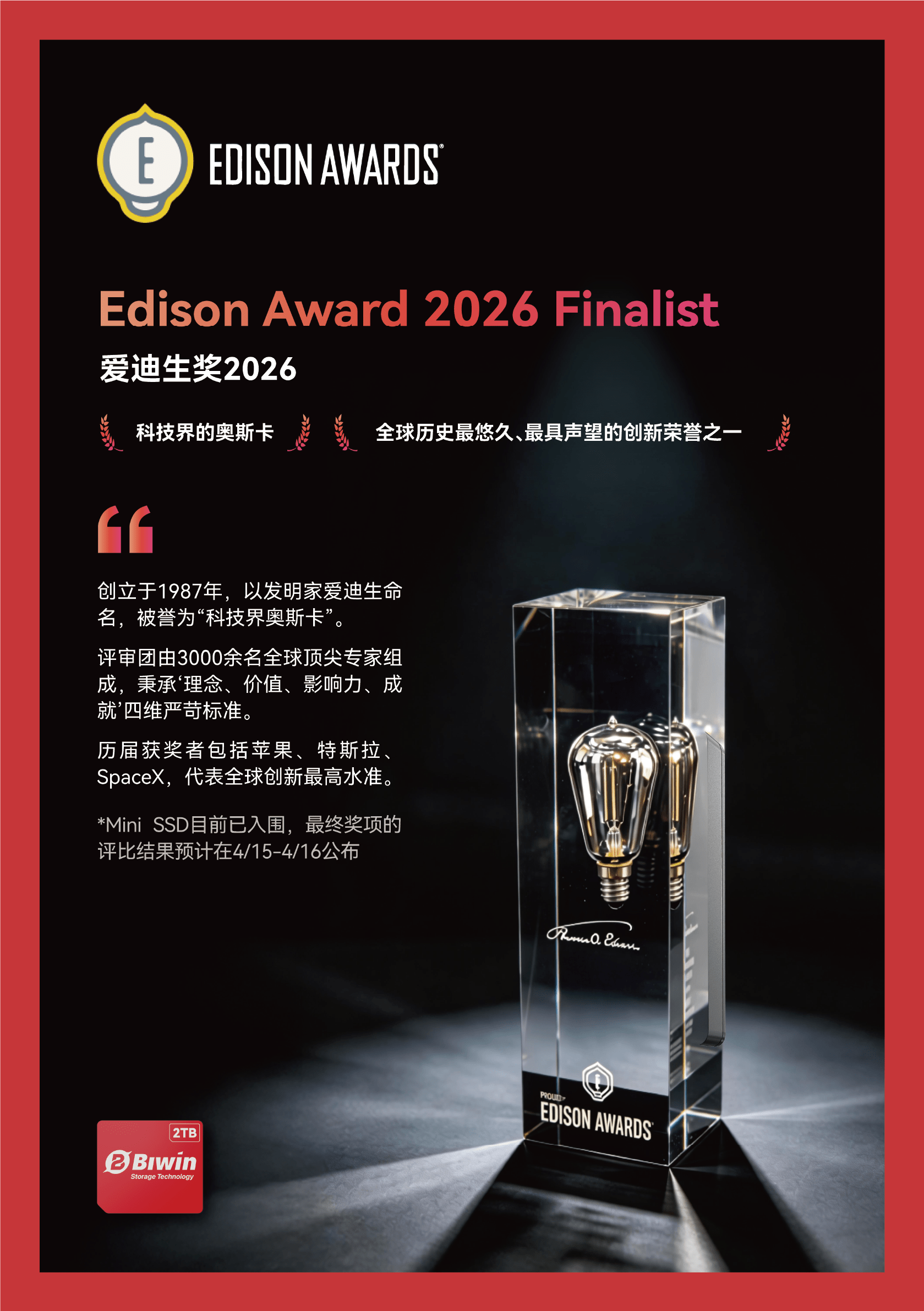 以发明家托马斯·爱迪生命名,被誉为“科技界的奥斯卡”,旨在表彰全球创新产品、设计及技术的卓越成就。评审委员会由3000余名全球顶尖学者、行业领袖及跨界专家组成,围绕“理念、价值、影响力、成就”四大维度评选,Mini SSD成功入围其决赛名单,意味着在技术创新、市场潜力及社会影响力三个维度上,均已达到世界顶级水准。
