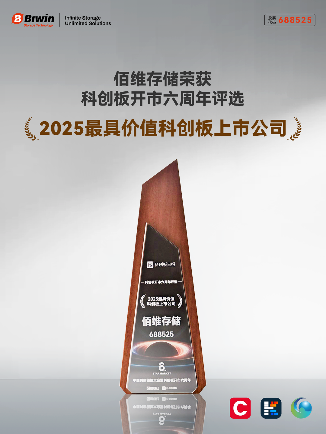 近日,由《科创板日报》、财联社与上海长三角G60科创集团联合主办的“2025中国科创领袖大会” 圆满举办,同期重磅发布了“科创板六周年评选” 榜单,作为科创50成分股,佰维存储(股票代码:688525)再度入选“2025最具价值科创板上市公司”,标志着资本市场对公司在技术创新、产业布局与长期价值创造上的持续认可。