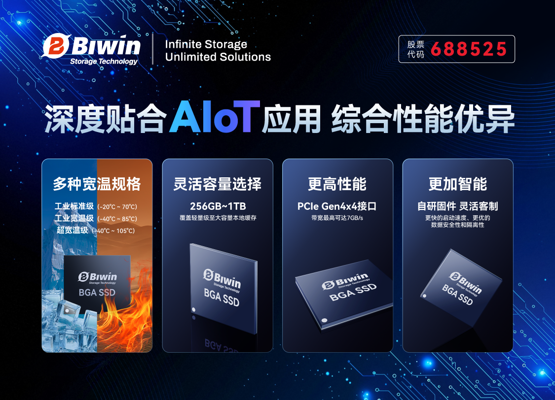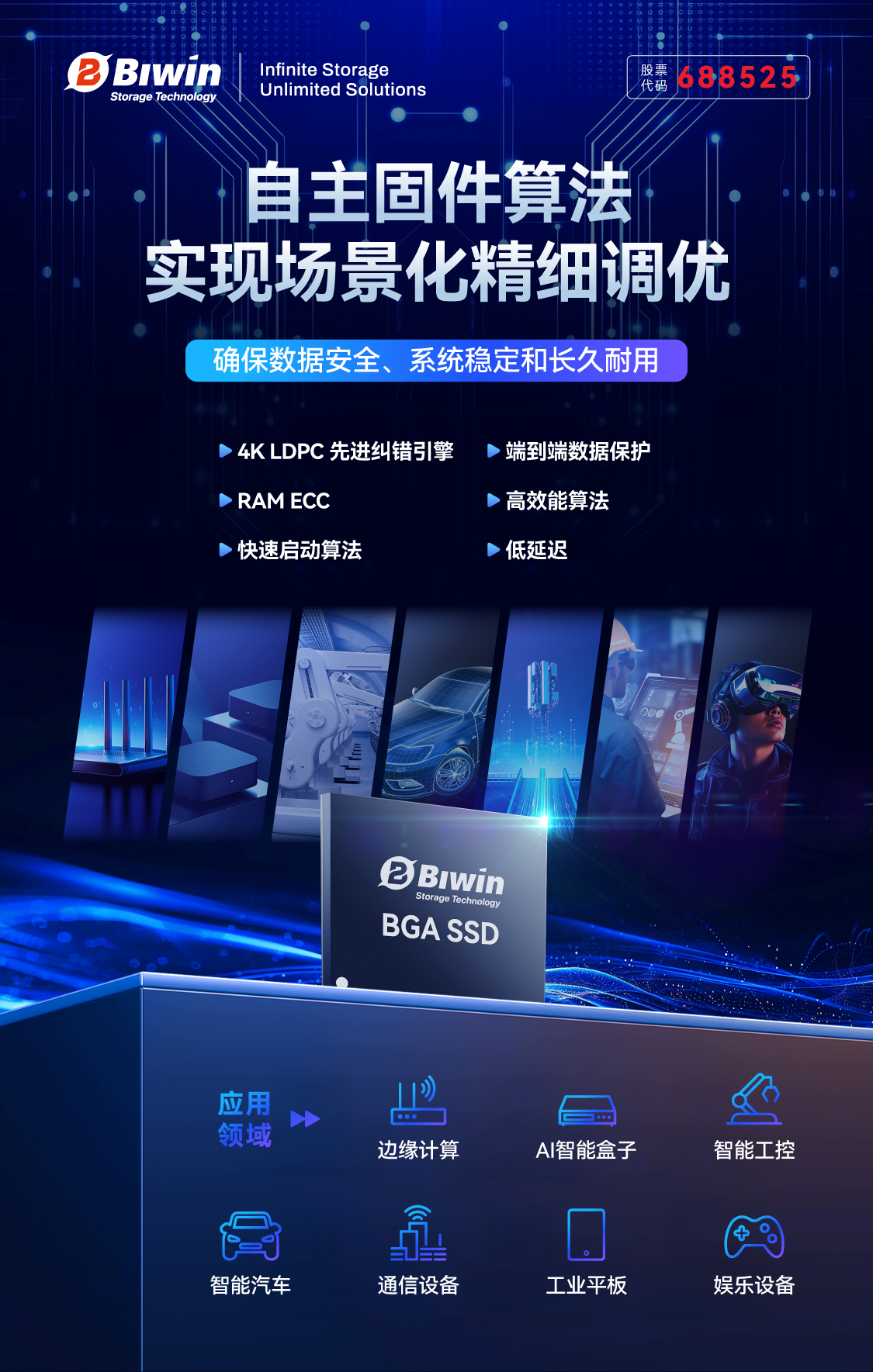 顺应边缘AI对高性能计算、高集成、与微型化的趋势,佰维存储推出工业级BGA SSD,在如五角硬币大小(16 x 20 x 1.3 mm)的尺寸内,提供高达1TB的存储容量与PCIe 4.0 x4的高速传输。BGA封装形式使该产品在需要频繁移动或受到机械振动的设备中更加可靠,广泛适配边缘计算、AI智能盒子、智能工控、智能汽车、通信设备、工业平板、娱乐设备等领域。