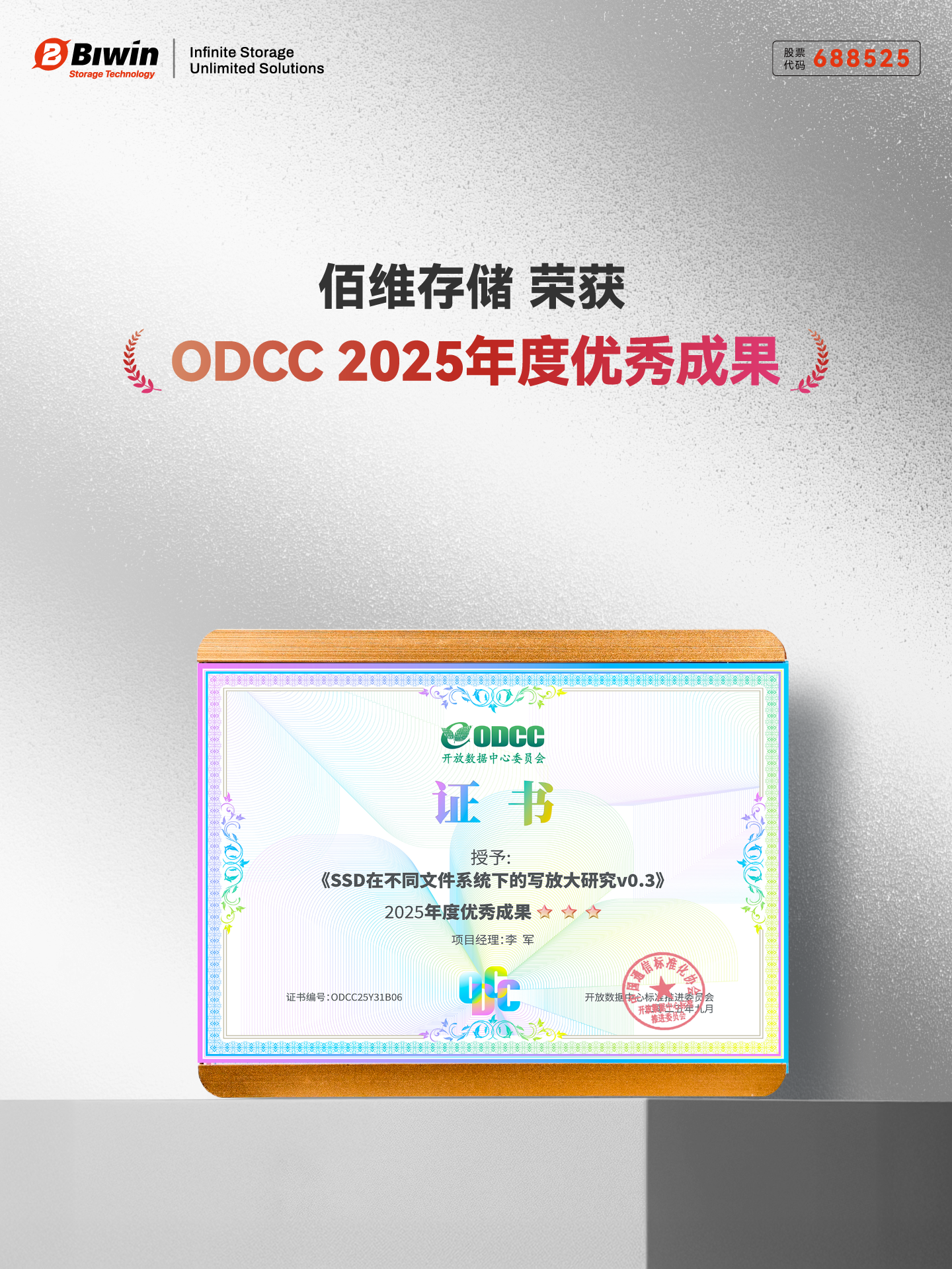 近日,在2025开放数据中心大会(简称“ODCC”)举办期间,由佰维存储主导并牵头制定的三大企业级存储行业标准分别荣获ODCC 2025年度杰出成果奖与优秀成果奖,充分体现了佰维存储在推动存储技术标准化、引领行业规范化与生态构建方面的核心地位与领导力。