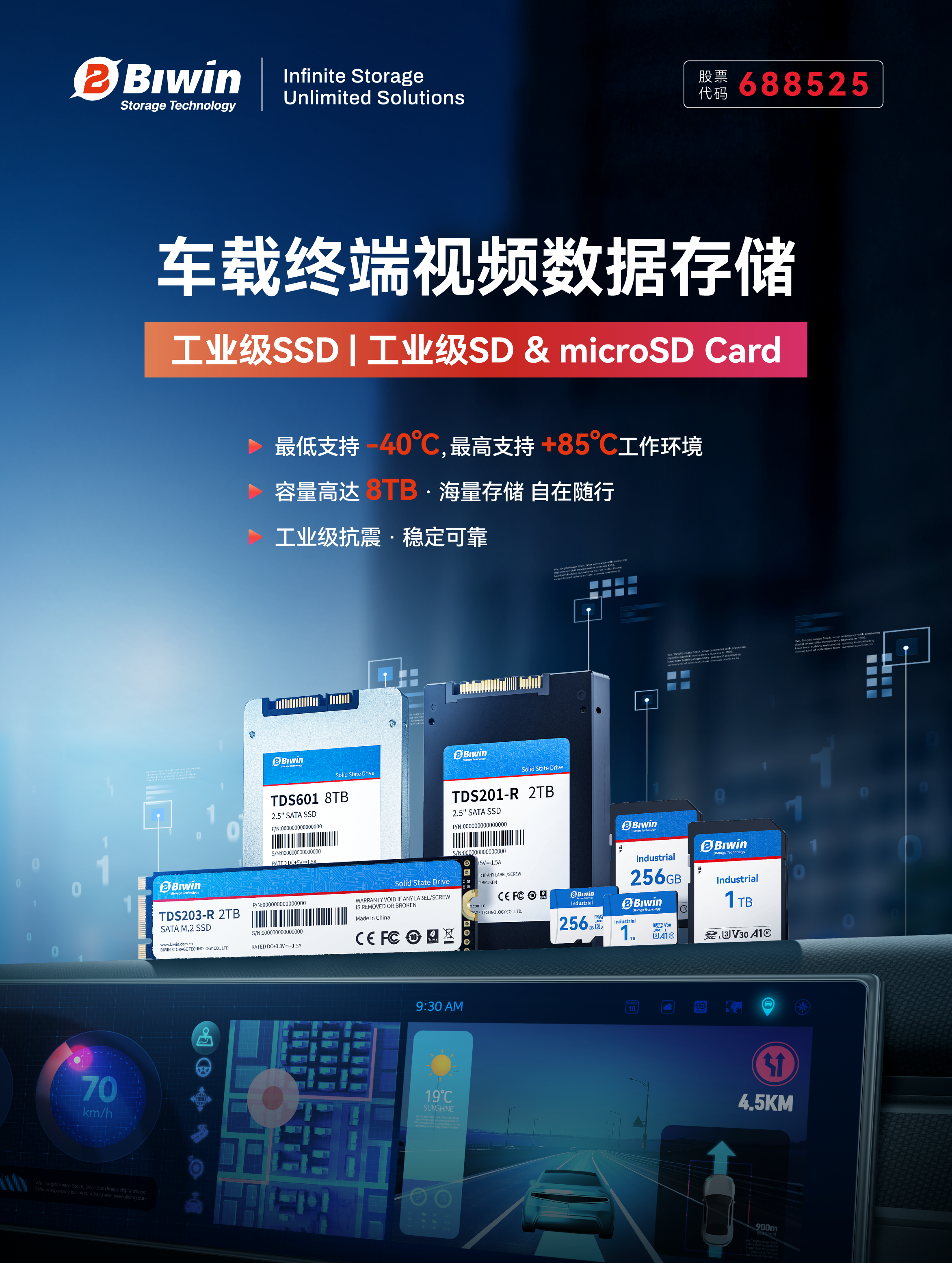 车载终端集成了视频监控、定位导航、远程通信、系统运行等多项功能模块,佰维特存基于不同应用场景和性能要求,提供涵盖SSD、eMMC、SD/microSD卡、DDR/LPDDR在内的存储产品矩阵,实现从系统存储到系统缓存再到视频数据记录的全域存储覆盖。