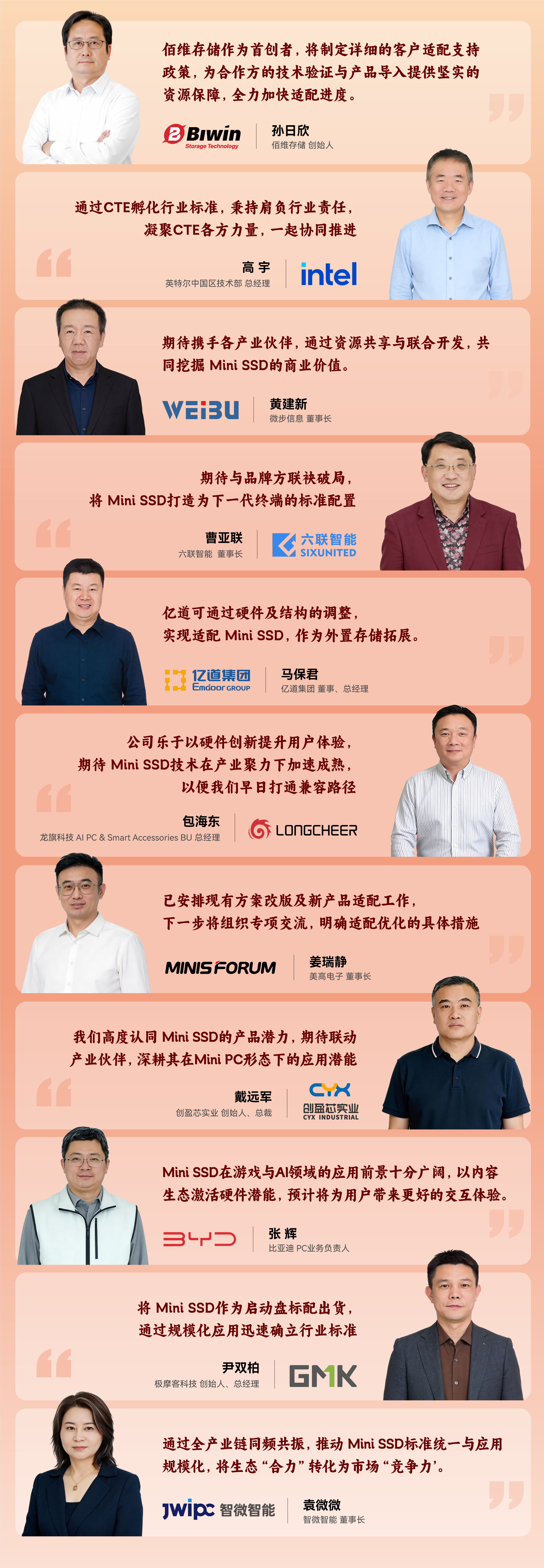 从顶层设计的利益共享,到技术导入的联合攻关,再到终端市场的价值变现,此次会议达成的三项共识,不仅为 Mini SSD 的后续发展注入了强劲动能、打开了广阔空间,更构建了一个开放、共赢、可持续的产业生态闭环。