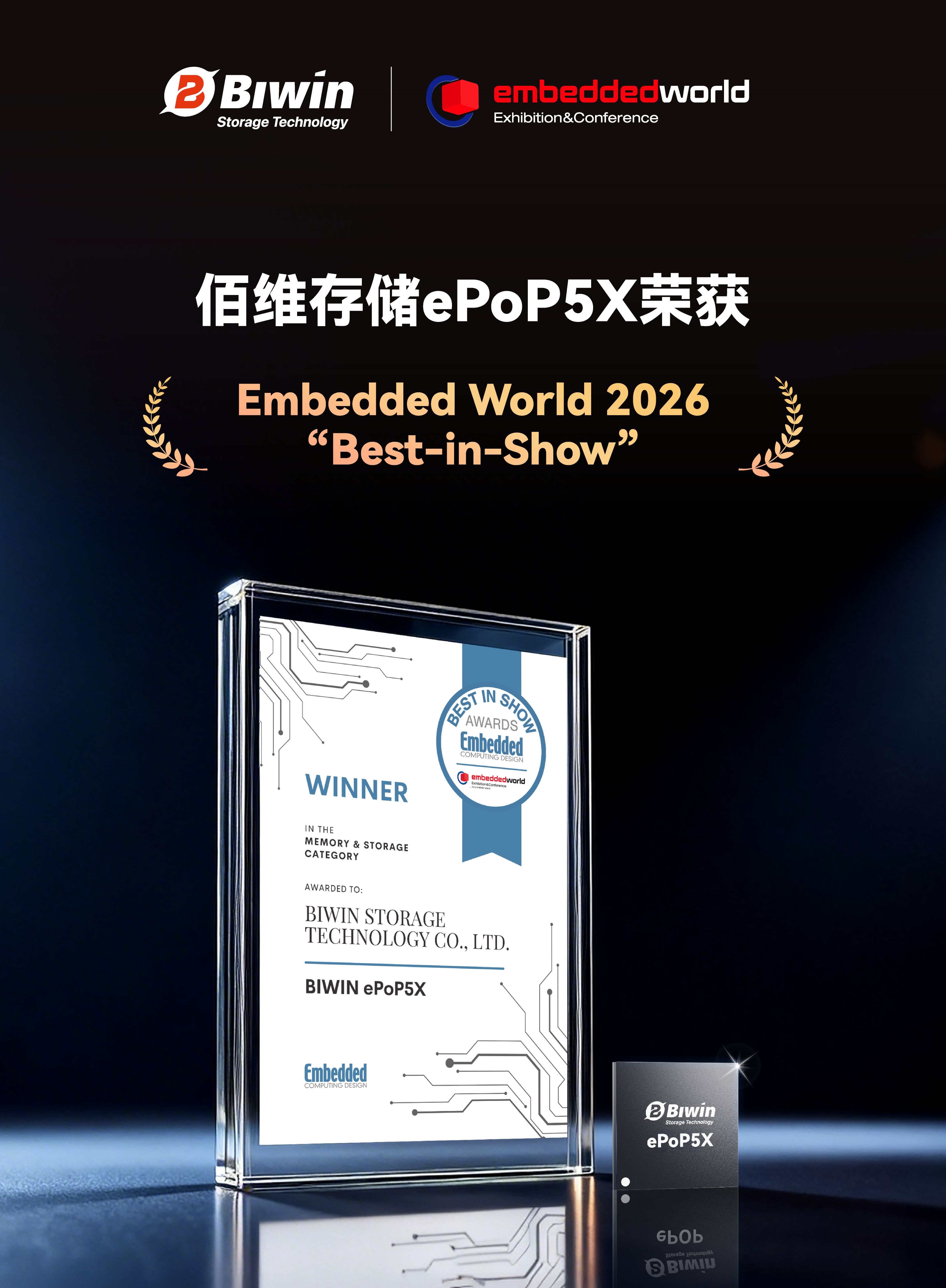 当地时间3月10日-12日,全球最大规模嵌入式行业盛会Embedded World 2026在德国纽伦堡举办。佰维存储携全场景存储产品矩阵与核心技术成果重磅亮相,旗下ePoP5X凭借对AI端侧存储需求的极致适配与技术突破,斩获Embedded World 2026「Best-in-Show」大奖,彰显中国存储企业在全球嵌入式领域的核心竞争力。